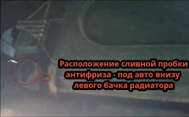 Теперь следует сбросить давление в системе, открутив крышку расширительного бачка ОЖ. Затем подставить емкость (вместимостью около семи литров) под сливную пробку, которая находится внизу левого бачка радиатора.