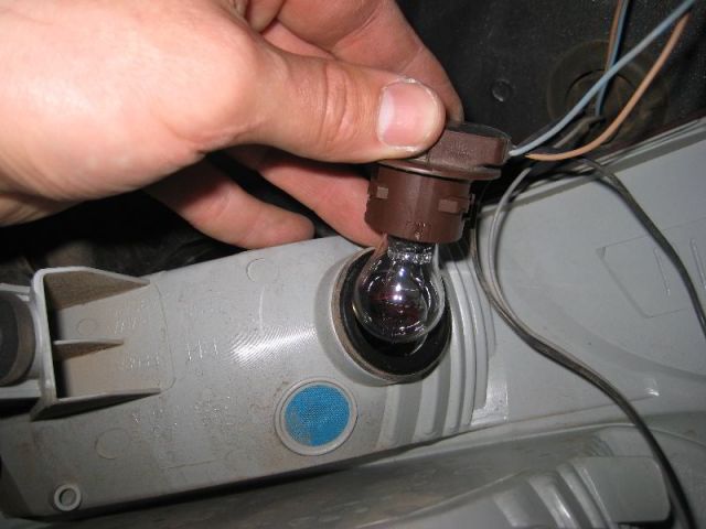 Для того чтобы достать старую лампочку габаритов из фары, необходимо просунуть палец внутрь фары и повернуть ее на 1/4 оборота против часовой стрелки. Далее ваша задача достать лампу вместе с разъемом питания.