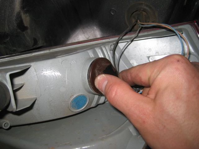 Сняв фонарь, надо повернуть на 1/4 оборота (против часовой стрелки) коричневый разъем питания лампы стопа-сигнала и вытащить ее из фары. Затем отсоединить старую лампу и подсоединить новую, после чего вставить разъем с лампочкой в фару и зафиксировать их оборотом на 1/4 по часовой.