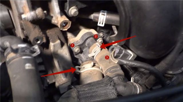 Отщелкнуть хомуты и отсоединить патрубки, затем открутить болты крепления корпуса термостата. Болт 3 не видно за патрубком.