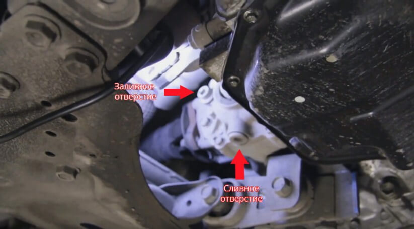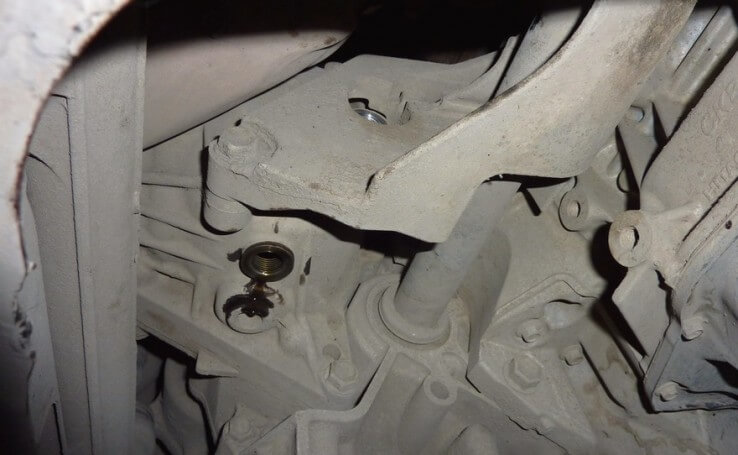 Но прежде чем откручивать и сливать сразу откручиваем болт заливного отверстия. Находится он в не очень удобном месте.