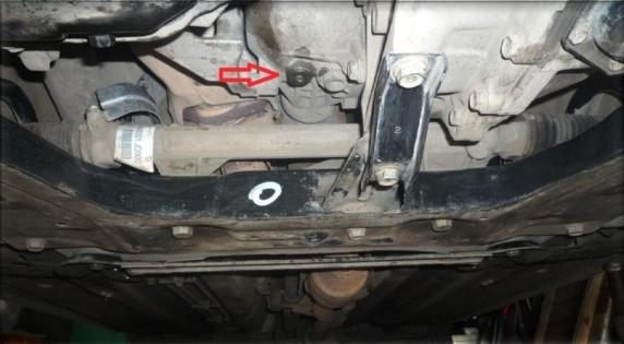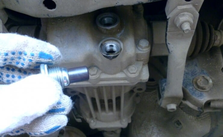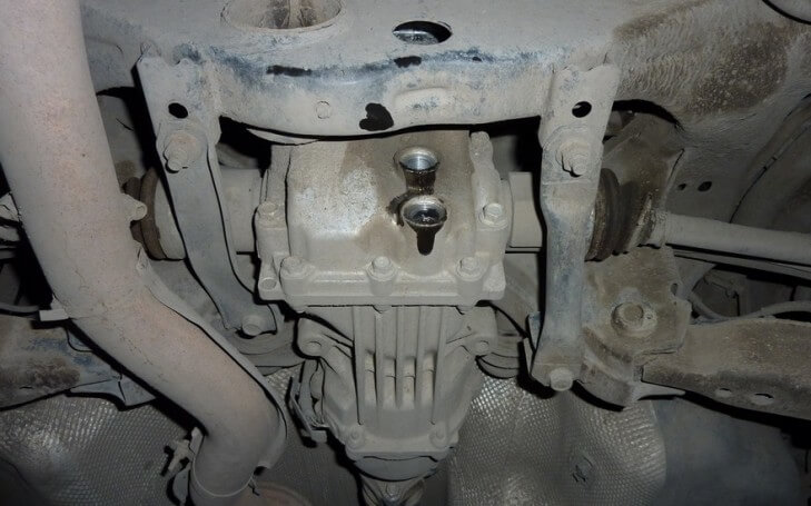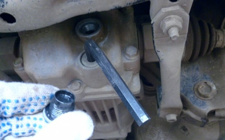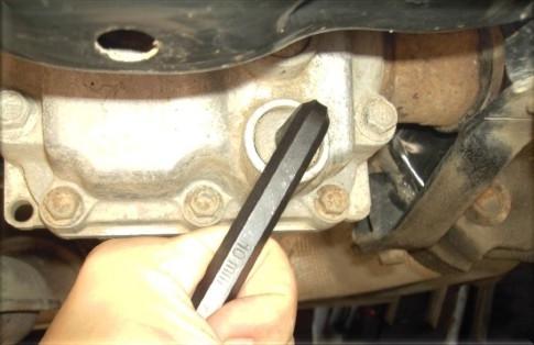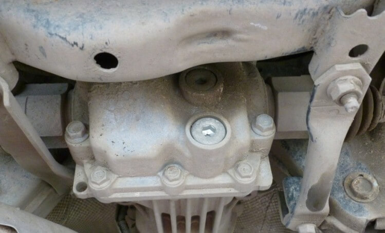 Процедура замены масла в заднем дифференциале (редукторе) идентична предыдущей. Сливная пробка снизу, смотрит назад.
