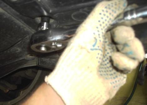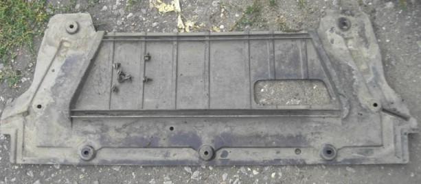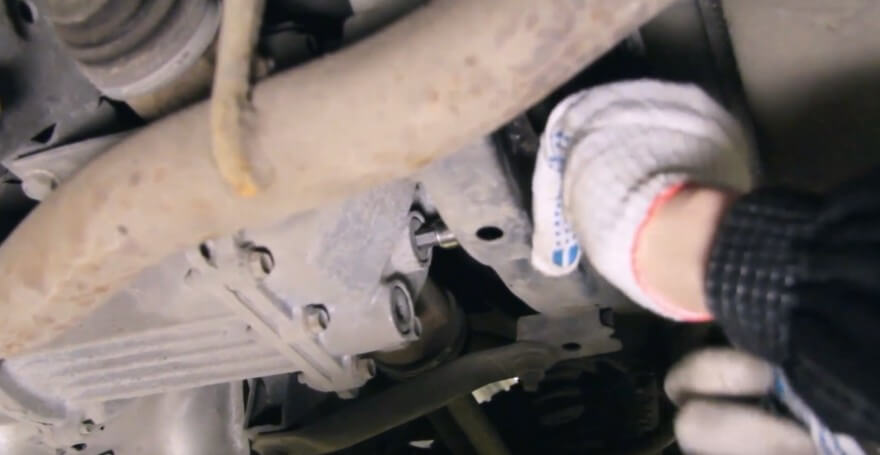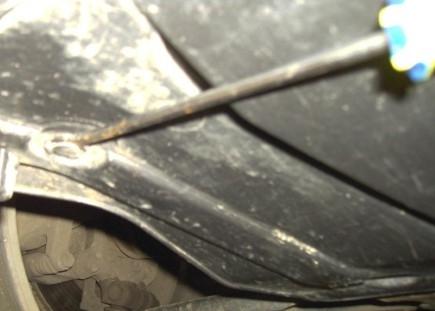 Открутите 2 болта на 10 по бокам крепления к передней части подрамника, снимите 4 пистона с боковых частей и 1 пистон с передней части подрамника. Удобнее всего действовать именно в этой последовательности. Для снятия пистонов нужно подцепить центральную часть пистона и потянуть ее вниз примерно на 8 мм. После этого Вы легко достанете пистон из отверстия.