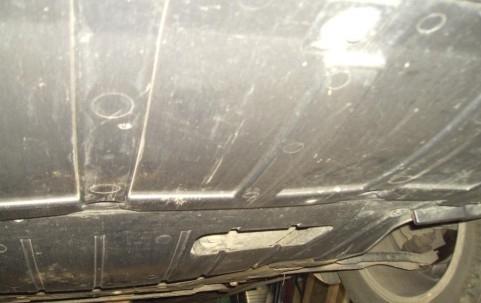 Для начала необходимо снять защиту картера/КПП согласно инструкции производителя или снять заднюю часть заводского щитка. Демонтаж производится на яме, эстакаде или подъемнике.