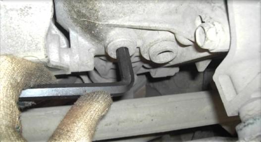 Первым выкручиваем болт заливного отверстия. Для того, чтобы открутить заливную пробку, придется перевернуть ключ длинной стороной к пробке, поскольку шестигранник нужен подлиннее.