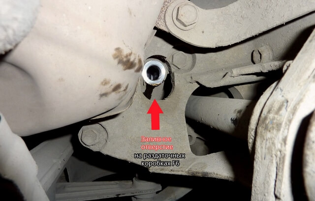 … а вот на раздаточных коробках F6 (ном. 33100JD60B) расположения сливных и заливных отверстий иное, но дело сути не меняет шестигранники для откручивания пробок, как и сами болты сливных отверстий одинаковые.