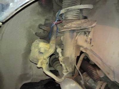 Отсоединяем от поворотного кулака рулевую тягу и шаровую опору от поворотного кулака Форд Фокус. На автомобиле с АБС снимаем датчик скорости вращения колеса, снимаем тормозной суппорт и тормозной диск. В итоге должен остаться полностью освобожденный поворотный кулак, смотрим фото далее.